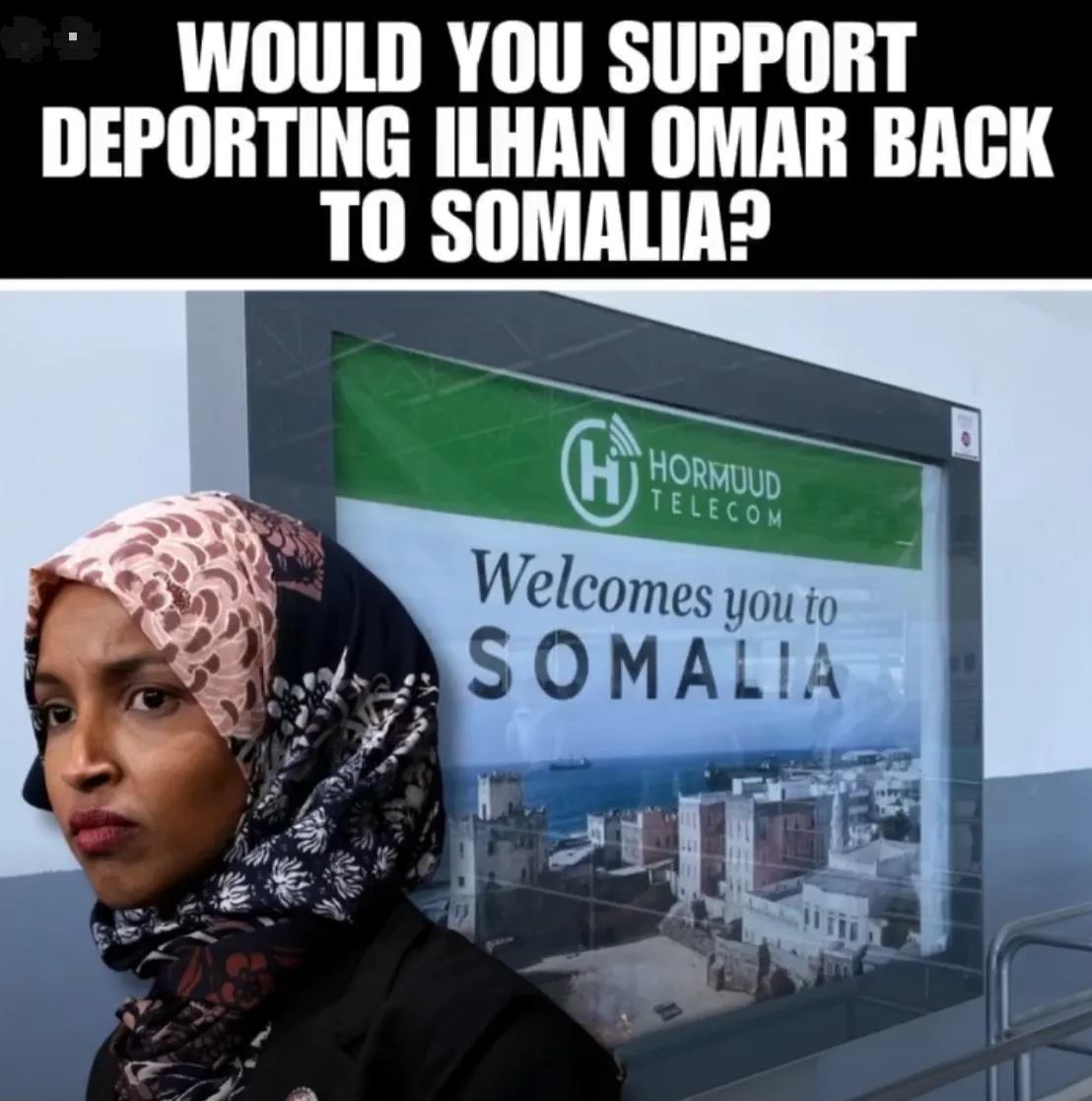 The graphic, plastered with the bold headline “WOULD YOU SUPPORT DEPORTING ILHAN OMAR BACK TO SOMALIA?”, spread at lightning speed across politically charged pages, igniting one of the most explosive online clashes of the year.